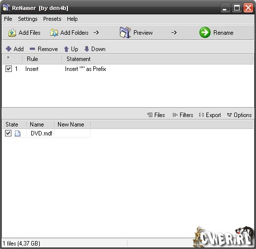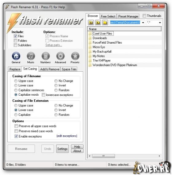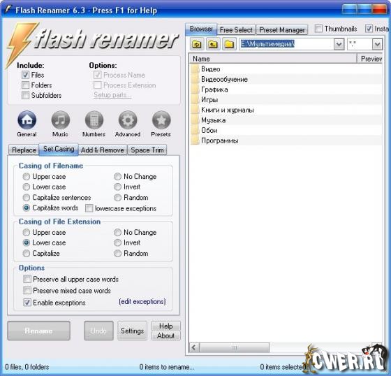 Flash Renamer - программа за считанные секунды позволит превратить непонятные названия файлов в удобные и информативные. Flash Renamer умеет: добавлять, удалять, искать и заменять текст в именах файлов, менять регистр и расширения, работать с MP3 тегами, отменять произведённые переименования и т.д. Отлично работает с папками и файлами всех типов, в том числе и музыкальными.