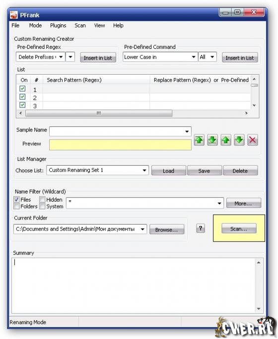 Pfrank - гибкая программа для переименования файлов (музыкальных файлов, картинок и т.д). Программа может изменять регистр букв, вставлять номера, вставлять названия папки, в которой расположены файлы, вставлять в название свойства файла, вставлять информацию из мета-тегов для музыкальных файлов, информацию EXIF для графических файлов и многое другое. Frank также имеет мощный движок регулярных выражений, а также уникальную опцию Path Builder, при помощи которой можно, например, превратить файл с названием 20061224abc.jpg в файл Newabc.jpg, который будет располагаться в папке 20061224.