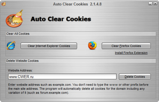 Auto Clear Cookies является мощным средством, которое позволит Вам стереть cookies с одного веб-сайта или доменного имени, или очистить все cookies из браузера Internet Explorer и Mozilla Firefox.