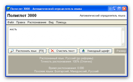 Полиглот 3000 (или сокращённо П3000) – это автоматический определитель языка, который предназначен для быстрого и корректного определения того на каком языке написан введённый Вами текст. Программа работает в операционных системах Windows 95/98/NT/ME/2000/XP/Vista/7.