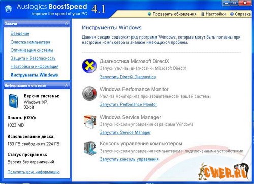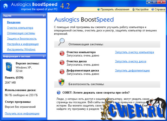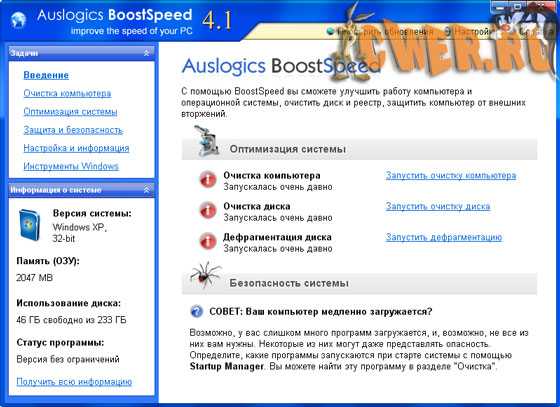 Обновилась популярная утилита для ускорения работы системы, программ и Интернет-соединения - BoostSpeed от компании AusLogics. Программа оптимизирует компьютерную память, ускоряет загрузку Windows, повышает быстродействие Microsoft Office, The Bat, FireFox, Opera, чистит реестр и диск компьютера. После дефрагментации реестра BoostSpeed, скорость компьютера возрастет за счет уменьшения фрагментации файлов реестра, уменьшения их размера, а также благодаря устранению ошибок в реестре.