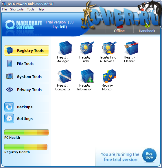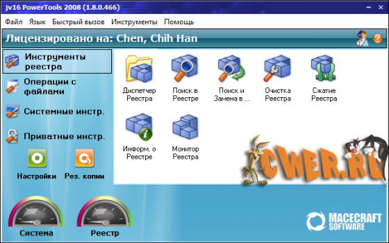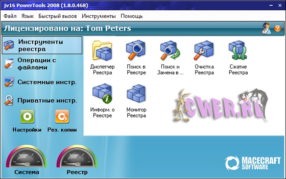 jv16 PowerTools 2008 - это одна из лучших программ для работы с системным реестром и поддержания в оптимальном состоянии. Включает в себя инструменты для работы с реестром: мощный менеджер реестра - позволяет работать со списком программ из автозагрузки и деинсталляции, со списком зарегистрированных в системе типов файлов, расширений, контекстным меню IE (с тем, в которое часто вставляют свои пункты менеджеры закачек) и некоторыми другими. Этот менеджер часто помогает вручную удалить остатки после автоматической очистки реестра программы. Возможно использование в локальной сети.