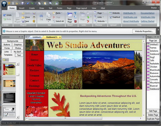 Web Studio - программа для создания веб - сайтов. Данная программа имеет все необходимое для создания сайта. Галерея изображений, кнопок, цветовых схем и других графических элементов, которые можно использовать для разработки веб - страниц. Вы также можете использовать собственные графические элементы дизайна. WYSIWYG интерфейс программы делает ее легким в использовании, и позволяет создать сайт профессионального качества. HTML редактор позволяет добавлять ваш собственный HTML код, а также изменять HTML объекты и страницы вашего сайта.