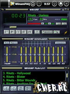 WinamPAQ - программа для Pocket PC, играет файлы в формате mp3 и формате Ogg Vorbis, а главное, поддерживает скины от популярнейшего WinAMP для ПК, которых в сети можно найти великое множество.