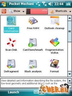 Pocket Mechanic Professional - утилита управления картами расширений: форматирование, дефрагментация, проверка и восстановление, тестирование производительности, тестирование на физические ошибки, удаление неиспользуемых файлов, установка имён папок для карточек (только для Windows Mobile 2003!), просмотр конфигурации TCP/IP и многое другое...