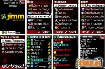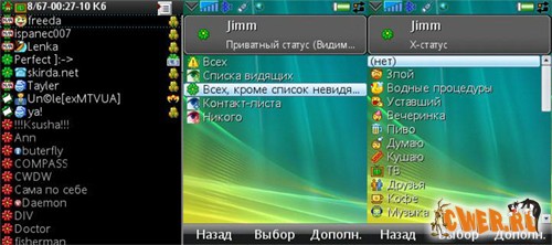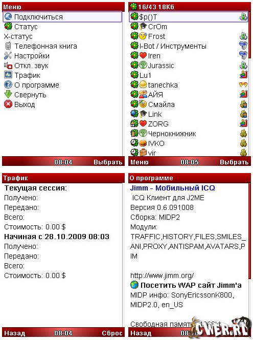 Jimm - ICQ-пейджер для мобильников с огромным количеством возможностей и настроек, с анимированными смайлами и возможностью создавать новый аккаунт. Все экраны