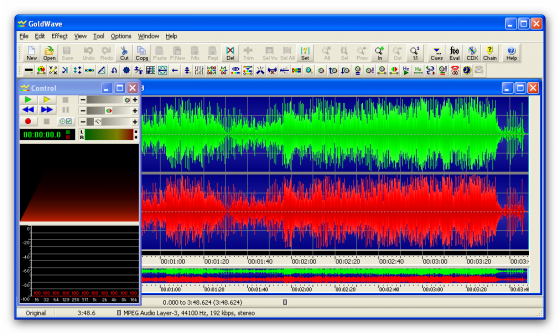 GoldWave - очень мощный звуковой редактор, предназначенный для проигрывания, редактирования, смешивания и анализа звуковых файлов. Умеет быстро работать с большими файлами. Имеет много разных эффектов. Понимает MP3, WAV, AU, IFF, VOC, SND, MAT, AIFF, raw, data, а также множество прочих форматов. Умеет конвертировать из одного формата в другой. С помощью GoldWave можно применять всевозможные эффекты (добавлять эхо, эффект "увядания" звука (Fade), редактировать эквалайзером и пр.) убирать шумы, реставрировать старые записи и т.д. GoldWave позволяет записывать звук с кассет, пластинок, радио, а также с микрофона. Инструмент CD Reader дает возможность делать точные копии треков аудиодисков.