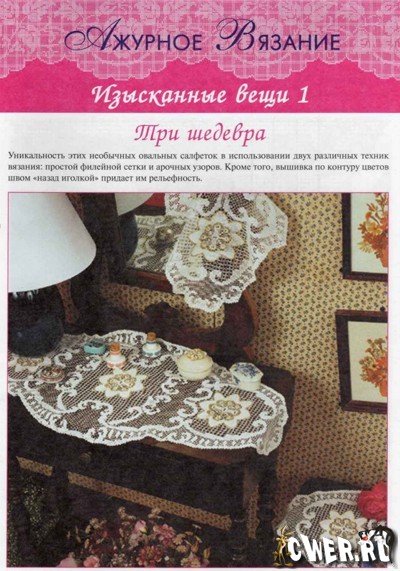 Большое количество ажурных вязаных изделий для украшения вашего дома: салфетки, кружева, накидки, картина, занавески; а также ажурной вязаной одежды.