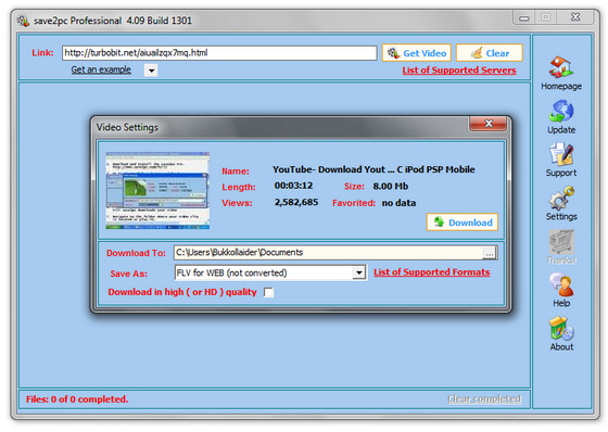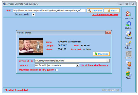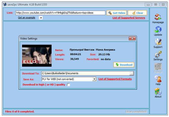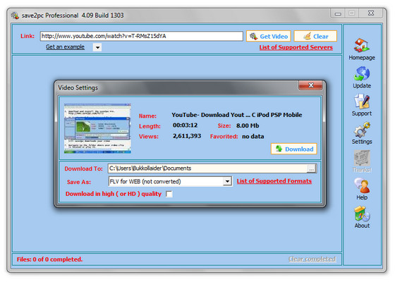 save2pc - программа для загрузки и конвертирования видео файлов, размещенных на популярном видео-хостинге YouTube. При помощи YouTube Downloader можно просто загрузить хоть какой видео файл веб-сервиса YouTube по приведенной на его страничке ссылке. Все, что требуется от юзера - это скопировать и вставить ссылку в особое окно програмки, выбрать хотимый формат и запустить автоматическую загрузку и конвертирование видео файла.