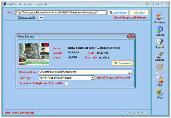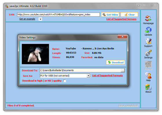 С помощью save2pc можно легко загрузить любой видео файл веб-сервиса YouTube по приведенной на его странице ссылке. Все, что требуется от пользователя - это скопировать и вставить ссылку в специальное окно программы, выбрать желаемый формат и запустить автоматическую загрузку и конвертирование видео файла.