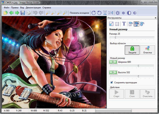 Image Resize Guide - программа для изменения размеров и пропорций фотографий без искажения важных частей и для удаления объектов без видимых следов. Программа содержит следующие инструменты изменения размера изображения и удаления объектов: Размер, Вырезать фрагмент, Умное удаление, Умный размер, Латание. В программу включены анимированные примеры обработки фотографий: простое изменение размера фото; изменение размера фото и сохранение объектов; простое удаление; удаление в два шага, удаление с защитой, латание, т е в программу включены анимированные демонстрационные примеры, которые по шагам объяснят как все это правильно сделать.