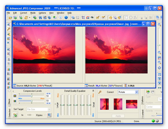 Advanced JPEG Compressor - одна из самых функциональных программ для сжатия изображений в формате JPEG. Возможно сжатие до 50% без потери качества. Программа обладает практически всем, что может только пожелать пользователь от программы для сжатия изображений. Главной особенностью программы является возможность просмотра сжатого изображения в режиме реального времени, т.е. вы увеличиваете или уменьшаете уровень компрессии, и картинка тут же изменяется. Таким образом, вы можете сразу увидеть результат. Есть также несколько фильтров для обработки изображений. Их можно использовать, если нужно сделать картинку более cглаженной или, наоборот, придать ей четкости. Программа несомненно будет полезна для web-дизайнеров, т.к. позволит значительно уменьшить объём графики на сайте, увеличив тем самым скорость его загрузки.