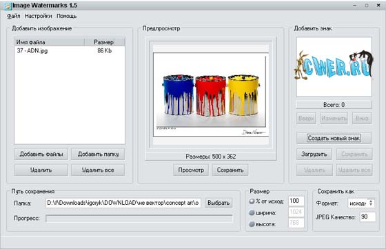 Программа Image Watermarks предназначена для создания водяных знаков на изображениях. Позволяет создавать знаки в виде текста, картинки с различными опциями (размер, цвет, позиция, прозрачность). Можно выбирать размер и тип сохраняемого файла. Есть возможность сохранять и загружать проекты знаков.