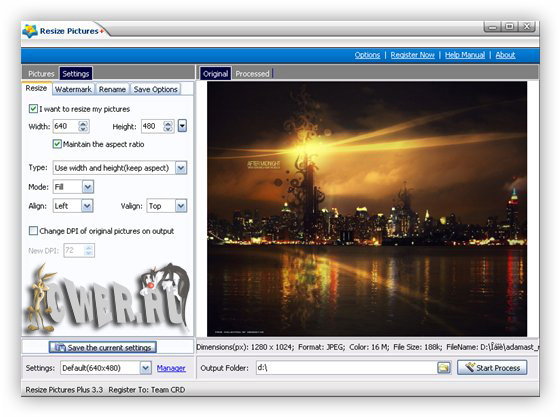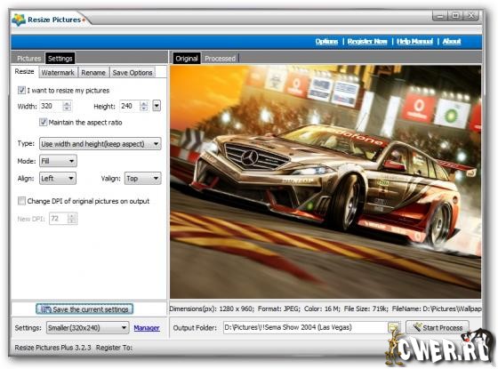 Resize Pictures Plus - простая в использовании программа для изменения размера и формата ваших фотографий в пакетном режиме. Позволяет пользователю в пакетном режиме изменить размер, качество, наложить водяной знак на картинку и конвертировать фотографии в один из форматов таких, как JPG, BMP, PNG, TIF, GIF, PCX и TGA.