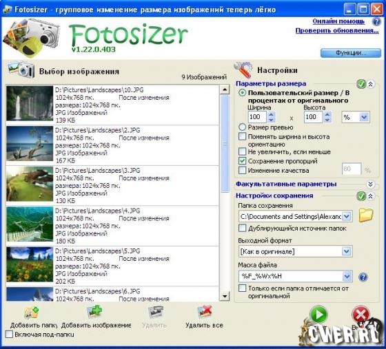 Программа Fotosizer предназначена для пакетной обработки графических изображений, а именно изменения их размеров. Программа позволяет за раз обрабатывать сразу большое количество картинок (целые директории), поддерживаются .JPG, .JPEG, .PNG, .BMP и .GIF форматы.
