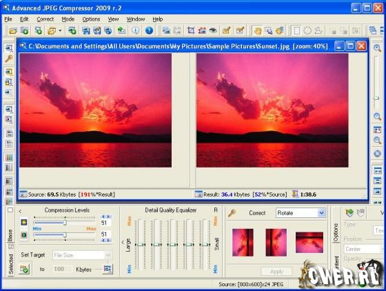 Advanced JPEG Compressor - одна из самых функциональных программ для сжатия изображений в формате JPEG. Возможно сжатие до 50% без потери качества. Программа обладает практически всем, что может только пожелать пользователь от программы для сжатия изображений. Главной особенностью программы является возможность просмотра сжатого изображения в режиме реального времени, т.е. вы увеличиваете или уменьшаете уровень компрессии, и картинка тут же изменяется. Таким образом, вы можете сразу увидеть результат...