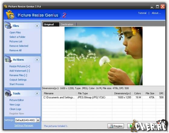 Picture Resize Genius - програма для обработки фотографий с поддержкой всех возможностей по редактированию, присущих данной категории программ, но отличающаяся более высокой скоростью работы в пакетном режиме и более продвинутым алгоритмом обработки. Программа поддерживает более 40 форматов графических файлов с возожностью их конвертации в форматы GIF, JPG, TIFF, PNG, BMP, MIFF или TGA , наносить текст поверх изображения, переименовывать файл и многое другое. Вы сможете производить все эти действия над сотнями файлов одновременно, в течение нескольких секунд.