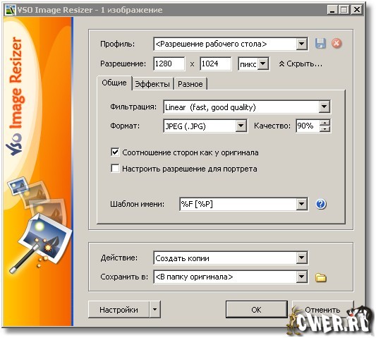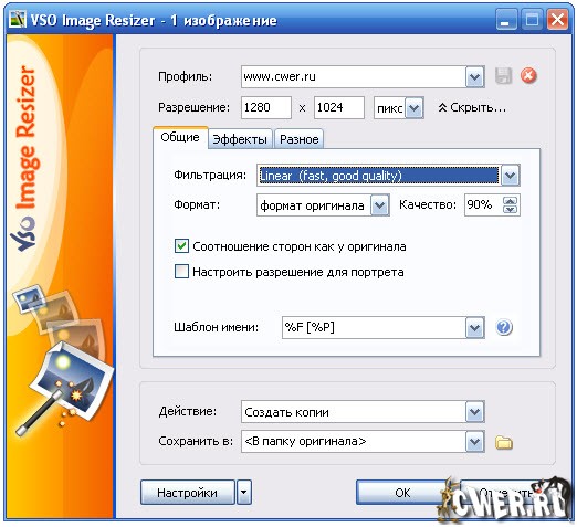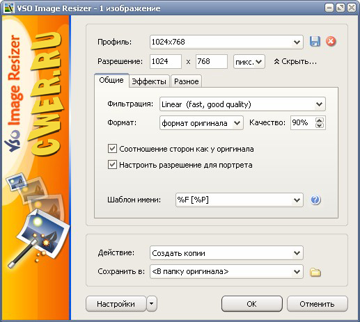 VSO Image Resizer - программа для изменения размеров цифровых картинок и изображений в различных графических форматах (на данный момент поддерживается работа с файлами JPEG, GIF, BMP, TIFF, CR2, NEF и т.д.). Также в утилите имеются возможности для компрессии файлов, конвертирования из одного формата в другой, экспорта, наложения прозрачных прозрачных и управления картинками. VSO Image Resizer интегрируется в оболочку Windows, может работать в пакетном режиме, обладает расширенными опциями настройки для продвинутых пользователей.