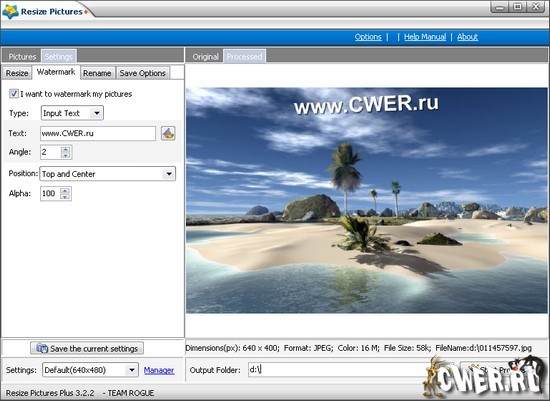 Resize Pictures Plus - простая в использовании программа для изменения размера и формата ваших фотографий в пакетном режиме. Позволяет пользователю в пакетном режиме изменить размер, качество, наложить водяной знак на картинку и конвертировать фотографии в один из форматов таких, как JPG, BMP, PNG, TIF, GIF, PCX и TGA.