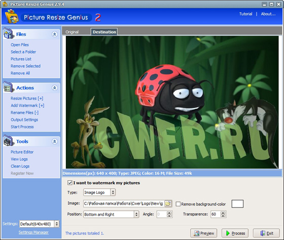 Picture Resize Genius дает возможность изменять размер целой группе рисунков, фотографий и изображений. Кроме этого можно наносить водяные знаки или логотип поверх изображения, переименовывать файл и многое другое. Вы сможете производить все эти действия над сотнями файлов одновременно, в течение нескольких секунд.