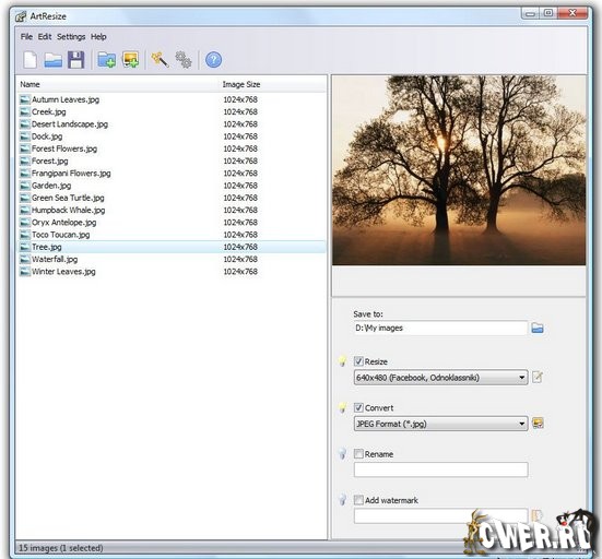 Программа для пакетного изменения размера, переименования и конвертирования изображений в форматы JPEG, BMP, PNG, TIFF и GIF.