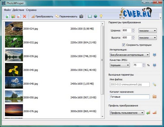 PhotoWhisper - это программа для пакетной обработки фотографий. Она позволяет быстро и просто изменять размеры и качество нескольких JPEG файлов одновременно, а также переименовывать их в соответствии с заданным шаблоном. При изменении размеров возможно выбрать один из шести алгоритмов интерполяции: метод ближайшего соседа, билинейная, бикубическая, сплайнами Митчел-Нетравали, сплайнами Катмула-Рома, Lanczos 3 (sinc-функцией). Каждый алгоритм имеет свои особенности и используется в зависимости от требований к конечному изображению, будь то, плавность перехода тонов, резкость и т.д. PhotoWhisper позволяет сохранять параметры преобразования в виде профилей и использовать их повторно впоследствии.