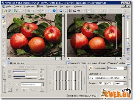 Advanced JPEG Compressor 2008 - лучшая программа для сжатия и оптимизации изображений в формате JPEG. Программа позволяет сжимать файлы до 70% без потери качества. Программа обладает практически всем, что может только пожелать пользователь от программы для сжатия изображений. Главной особенностью программы является возможность просмотра сжатого изображения в режиме реального времени, т.е. вы увеличиваете или уменьшаете уровень компрессии, и картинка тут же изменяется. Таким образом, вы можете сразу увидеть результат.