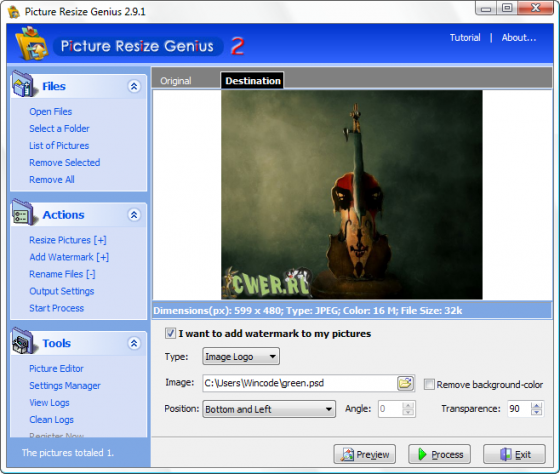 До версии 2.9.2 обновилась программа Picture Resize Genius. Picture Resize Genius дает возможность изменять размер целой группе рисунков, фотографий и изображений. Кроме этого можно наносить водяные знаки или логотип поверх изображения, переименовывать файл и многое другое. Вы сможете производить все эти действия над сотнями файлов одновременно, в течение нескольких секунд.