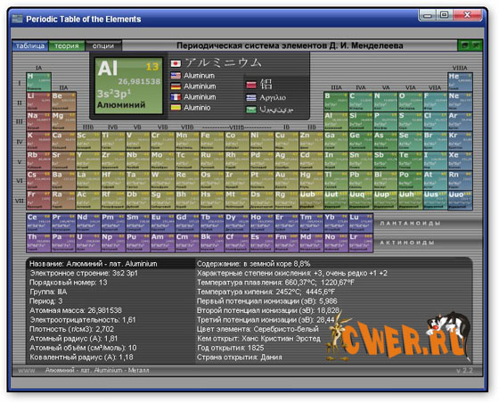 Компьютерная версия знаменитой таблицы Менделеева. Справочник по всем известным химическим элементам. При нажатти на какой либо элемент будет выведена дополнительная информация. Также к программе прилагается файл справки в котором тоже немало всякой там информации о каждом элементе и о его группе.