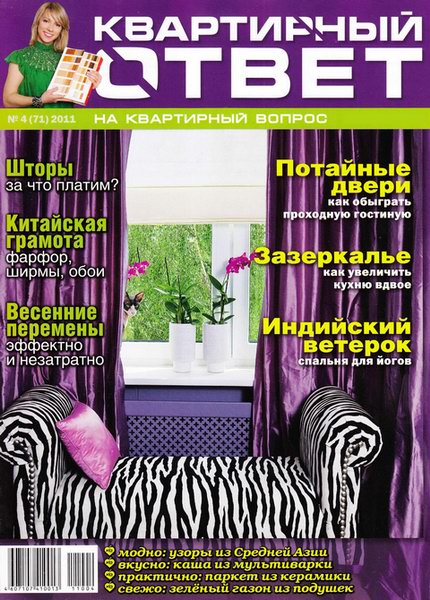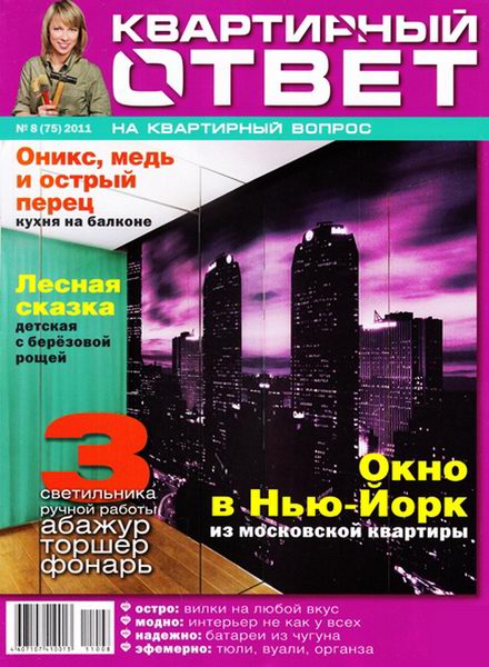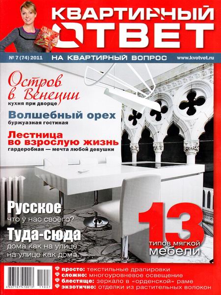 "Квартирный ответ" - иллюстрированный журнал, созданный на базе телепередачи канала НТВ "Квартирный вопрос" с детальной проработкой проектов, разбором дизайнерских решений, описанием использованных материалов. Полноцветный глянцевый журнал, посвященный интерьеру и дизайну, полностью соответствует свою телевизионному аналогу – и по тематике, и по уровню качества.