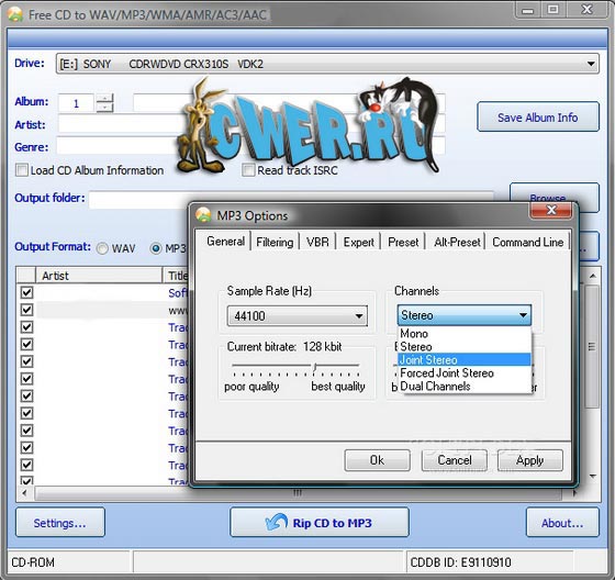 Free CD to WAV/MP3/WMA/AMR/AC3/AAC Ripper - бесплатная и простая в использовании программа, которая позволяет извлекать аудиодорожки с компакт дисков и конвертировать их в форматы WAV, MP3, OGG, AMR, AC3, WMA, AAC. Присутствует поддержка базы данных CDDB, а также имеется возможность автоматического определения наличия CD-диска.