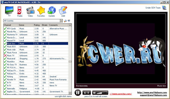АnyTV Pro - быстрая и удобная программа для просмотра более 2800 TV каналов из России и зарубежья, а так же прослушивания 5000 радио-станций со всех уголков нашей планеты. Все каналы можно сортировать по жанру, стране, битрейту или краткому описанию. Понравившийся канал можно занести в список избранного для быстрого доступа в дальнейшем. Установив AnyTV вы получите доступ к новостям, развлекательным передачам, каналам для взрослых, документальным фильмам, музыке, спорту, мультфильмам, каналам культуры и религии, а также к "живым" камерам со всего мира.