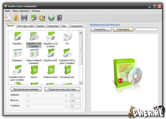 Insofta Cover Commander позволяет создавать профессиональные виртуальные коробки, книги, DVD-коробки, руководства, CD-диски, скриншоты. Всего несколько щелчков мыши все что нужно для выполнения этой работы. Исчерпывающие настройки освещения, камеры, тени, отражения позволяют вам создать изображение любого уровня сложности и увидеть готовый результат в реальном времени в окне предпросмотра. Мастер создания нового проекта выполнит всю "грязную" работу за вас, так что вы сможете сосредоточиться на содержании вашего проекта.