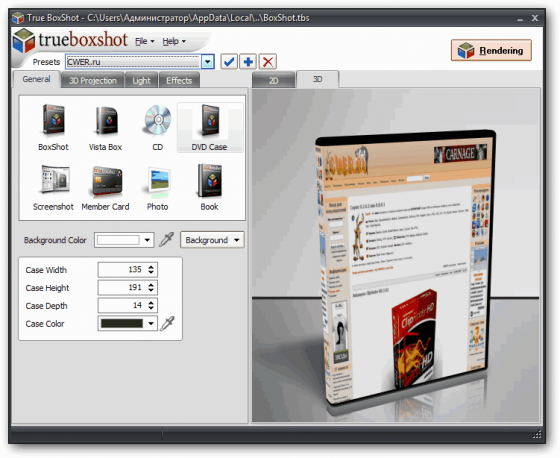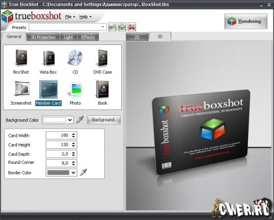 True BoxShot - программа для создания трехмерных графических изображений коробок для софта, клубных карт, компакт-дисков, DVD-коробочек. Успех продукта во многом зависит от его упаковки и презентации потребителям - это закон рынка. Для компьютерных программ так называемая упаковка и презентация делаются с помощью боксов. Боксы - это первая вещь, на которую обращает внимание покупатель при выборе программы. Дальше идет презентация программы, посредством которой покупатель может лучше ознакомиться с программой, что оставляет позитивное впечатление у него. Качественные картинки, создаваемые с помощью True BoxShot делают виртуальную презентацию любого продукта особенно привлекательной и запоминающейся.
