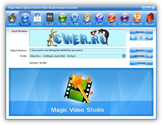 Magic Video Capture/Convert/Burn Studio - эта программа позволяет захватить и обработать "сырое" видео с любого источника, преобразовать его в нужный формат и прожечь CD или DVD диск. Есть пакетный режим конвертирования, предварительный просмотр результата, поддержка PAL и NTSC систем, настройка параметров конвертирования и качества, создание и прожиг DVD, VCD, SVCD видеодисков, поддержка большинства пишущих приводов, высокое качество и скорость работы, приятный и простой интерфейс. Данная программа преобразует видео между такими форматами как AVI (DivX, XviD и т.д.), MPEG 1,2 и 4, QuickTime, Real Video, WMV и DVD, SVCD, VCD.