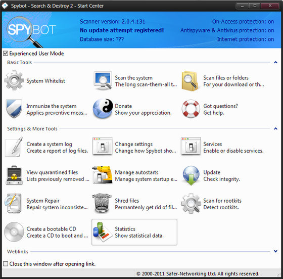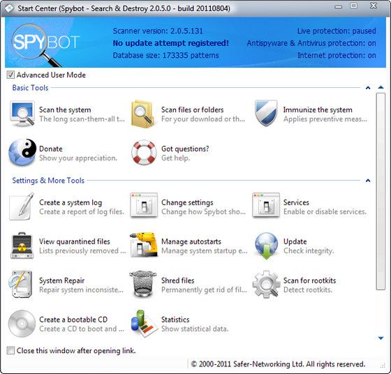 Spybot - Search & Destroy - утилита для поиска и удаления программ-шпионов (spyware), рекламных вставок (adware), программ похитителей данных (hijackers) и прочего вредоносного ПО. Spybot - Search & Destroy сканирует жёсткий диск и реестр операционной системы, выявляя тем самым шпионские модули и вредоносные ключи. База данных программы постоянно обновляется разработчиками, её обновление происходит из соответствующего раздела, аналогично обновлению антивируса. Интерфейс прост и понятен: кнопок и управляющих меню - минимум, работать с программой не составляет труда. Перед проверкой системы на наличие в ней шпионских модулей рекомендуется сделать копию реестра. В программе также предусмотрен откат, т.е. вы всегда можете вернуть ключи и файлы, которые были удалены. Несмотря на свою бесплатность, эта программа является одним из признанных лидеров в своём классе.