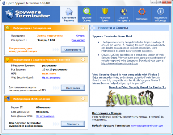 Spyware Terminator - программа для защиты компьютера от различных вредных модулей - spyware, adware, кейлоггеров и других троянов. Имеет резидентный монитор, который в реальном времени проводит мониторинг системы и предотвращает попытки проникновения на компьютер вредоносного ПО. Кроме этого, имеющийся в программе сканер поможет отыскать и поместить в "карантин" или удалить уже внедренные объекты. Работает программа очень быстро... Spyware Terminator имеет опцию автоматического обновления своих баз через Интернет, а также умеет производить проверку по расписанию.