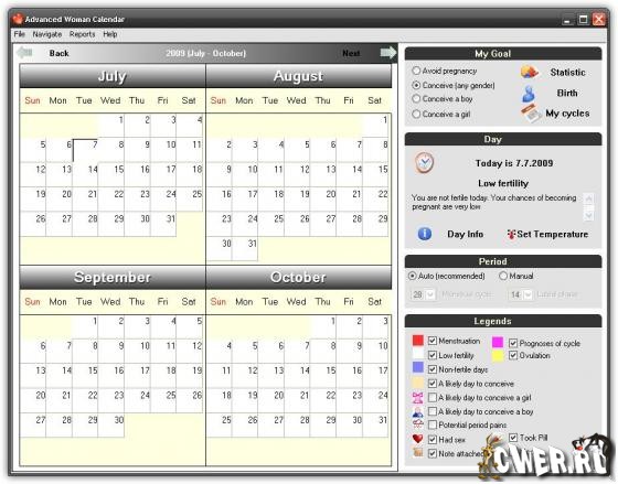 Advanced Woman Calendar - это надежный и простой в использовании женский календарь. Он вычисляет дни цикла с высокими и низками шансами зачатия, помогая вам тем самым избежать нежелательной беременности, либо, напротив, зачать ребенка. Программа также поможет Вам повысить шансы зачатия мальчика либо девочки. Женский календарь поможет вам использовать метод натуральной контрацепции. Он показывает дни с повышенной вероятностью зачатия, дни овуляции и месячных в виде цветного календаря.