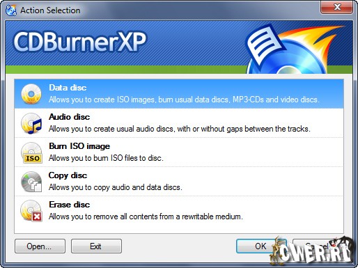 CDBurnerXP - программа для записи CD и DVD, включая Blu-Ray и HD-DVD. Пишет данные с жесткого диска и из ISO имиджей, записывает CD с данными и аудио-CD. Кроме этого, позволяет создавать загрузочные диски, переписывать аудиоCD на жесткий диск "на лету" в файлы MP3, OGG, WMA, WAV, а также сохранять образы CD в виде ISO-файлов. CDBurnerXP может работать как с обычными, так и с перезаписываемыми дисками и понимает "мультисессии".