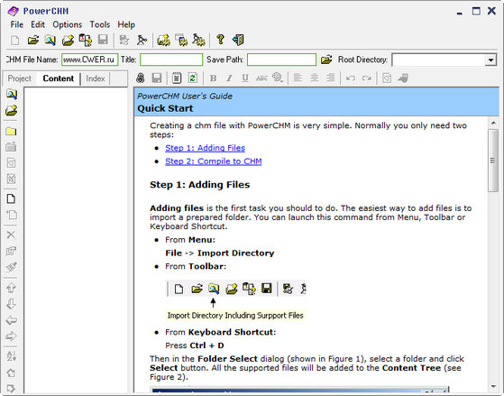 PowerCHM - инструмент для редактирования и создания профессиональных CHM-файлов помощи из файлов html, текстовых файлов, документов Microsoft Word (chm из форматов *.doc, *.txt, *.htm, *.html). Есть возможность декомпиляции (обратный процесс) на составные части ранее созданного *.chm файла, как одного, так и нескольких сразу (пакетная декомпиляция). Программа может автоматически генерировать заголовок справки помощи по заголовку или названию файла.