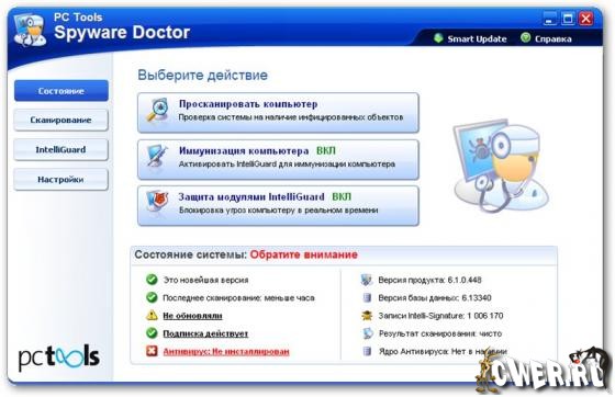 Spyware Doctor with AntiVirus - программа для борьбы с программами-шпионами, включающие в себя и антивирусный модуль. Решение позволяет защитить компьютер от шпионских программ (spyware), троянов, кейлоггеров, вирусов, червей, adware, всплывающих окон, ненадежных сайтов и многих других угроз. Программа автоматически конфигурируется, с минимальным количеством запросов, для обеспечения оптимальной защиты. Усовершенствованная технология OnGuard программы Spyware Doctor with AntiVirus предупреждает пользователей о факте обнаружения программ-шпионов и вирусов. В программе предусмотрена отлаженная функция обновления.