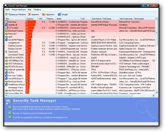 Security Task Manager - менеджер процессов, оценивающий степень опасности любого запущенного процесса в системе и присваивающий каждому из них определённый рейтинг. При запуске Security Task Manager проводит предварительный анализ всех работающих процессов, отслеживает тип их запуска, проверяет используемые библиотеки и компоненты, а затем на основе полученной информации выставляет каждому из них свою оценку, руководствуясь которой пользователь примет нужное решение.