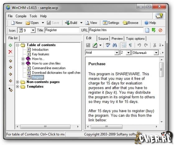 WinCHM - удобная программа для создания файлов помощи, книг или журналов в форматах HTML help(CHM), Web help, PDF и документах Word. Страницы справок создаются в удобном редакторе, большим плюсом является то, что она не использует сторонних компиляторов, при этом имеет сравнительно небольшой размер.
