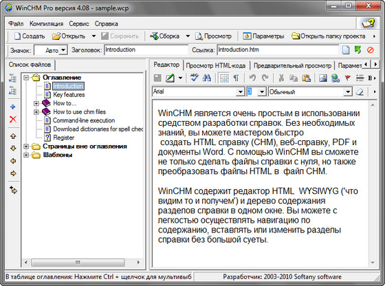 WinCHM - удобная программа для создания файлов справки, книг или журналов в форматах HTML-справка (CHM), веб-справки, PDF и документах Word. Страницы справок создаются в удобном редакторе, большим плюсом является то, что она не использует сторонних компиляторов, при этом имеет сравнительно небольшой размер. Особенности: встроенный визуальный HTML-редактор; автопоиск html-файлов и автосоздание оглавления; редактор оглавлений и значков; визуальный дизайнер CHM.