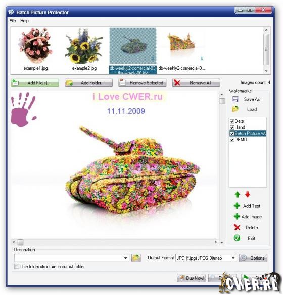 Это мощная и в то же время легкая в применении программа для создания подписей и штампов на изображениях. Она защитит ваши изображения, фотографии и рисунки с помощью добавления профессиональных штампов, логотипов, надписей и водяных знаков. Водяные знаки могут содержать информации о владельце изображений, копирайт, адрес веб сайта и лого вашей фирмы. Batch Picture Protector это быстрый и эффективный способ защитить ваши изображения.