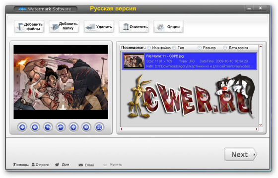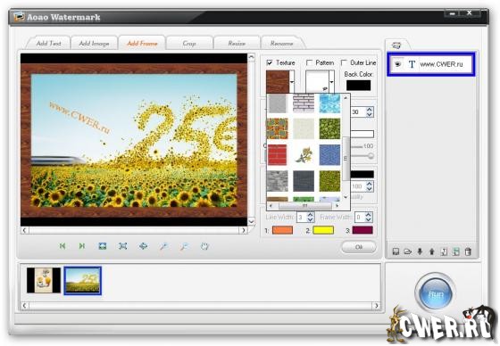 Watermark Software - программа для наложения водяных знаков на ваши изображения. Программа поможет вам добавлять текст, графику и логотипы на ваши картинки для защиты ваших авторских прав. Кроме нанесения водяных знаков, данная программа позволит вам добавлять привлекательные рамки к вашим фотографиям, обрезать фотографии, переименовывать несколько файлов в пакетном режиме, изменять размер изображений и многое другое. Данная утилита обладает быстрой обработкой фотографий и имеет поддержку всех популярных графических форматов. Программа имеет приятный и легкий в использовании пользовательский интерфейс.