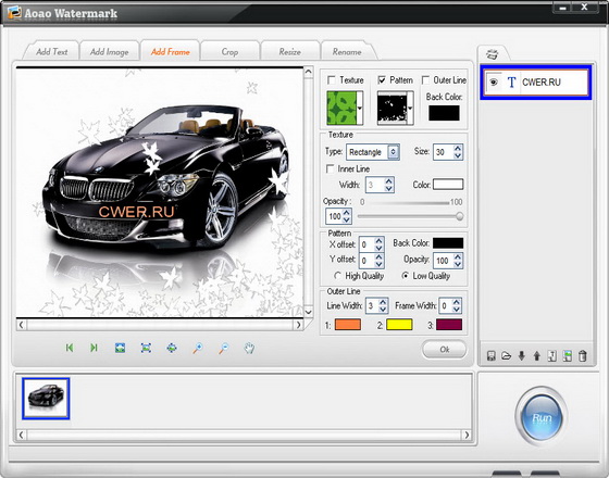 Batch Watermark Creator - программа для наложения "водяных" знаков на графические изображения. "Водяные" знаки могут быть размещены в любой части изображений, для них можно установить уровень прозрачности, добавить тень. Программа позволяет также выполнять несложные операции по корректировке изображений настраивать яркость, насыщенность, оттенки. Есть возможность пакетного наложения "водяных" знаков на изображения.