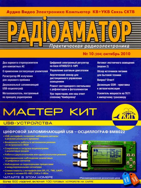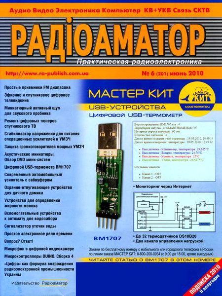 Журнал «Радиоаматор» - увлекательный путеводитель в мир радио для тех, кто ради увлечения либо по роду своей профессиональной деятельности работает в эфире, занимается разработкой и ремонтом разнообразных радиоэлектронных устройств. Это журнал для тех, кто привык работать со схемой на столе и с паяльником в руках, кто своим призванием считает практическую радиоэлектронику.
