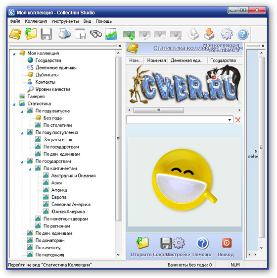 Collection Studio программа, которая помогает коллекционерам для учета своих коллекций монет, банкнот, почтовых марок, плакатов, дисков, фильмов и др. Она позволяет отобразить всю коллекцию в одном списке или частично в зависимости от критерия выборки и сортировки. Легкие для использования инструменты помогают быстро и удобно вносить изменения и дополнения в базу вашей коллекции, позволяя наслаждаться удивительным миром коллекционирования.