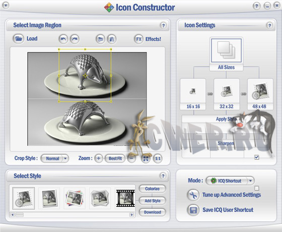 Программа для создания иконок. Достаточно выбрать нужную картинку или кадр клипа, отметить на нем область захвата и выбрать шаблон для иконок. Готовые иконки можно сохранить в формате ico (в виде комплекта иконок стандартных размеров) или png, gif, jpg. Также Icon Constructor может создавать ярлыки с персональными иконками для запуска ICQ, отправки E-mail или просто для папок.